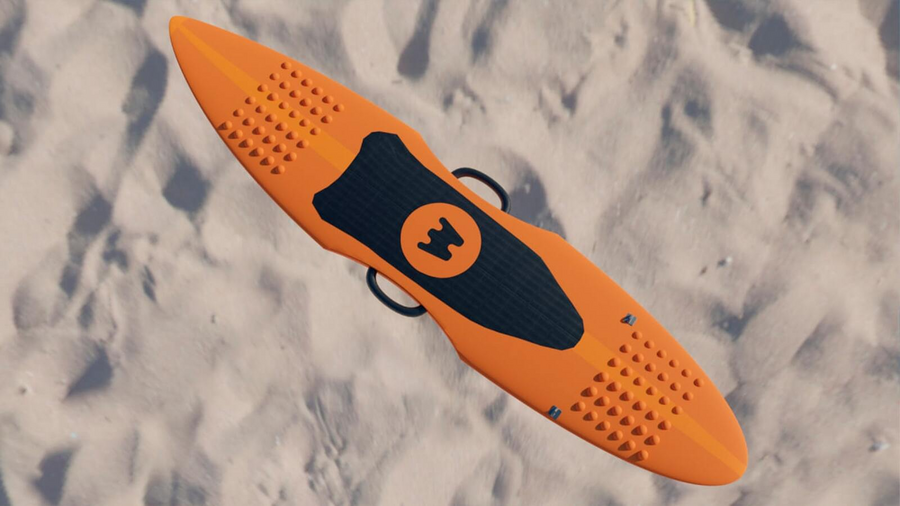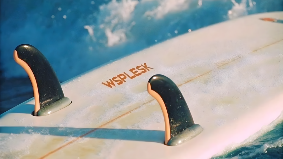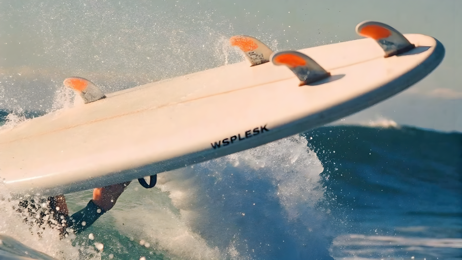 ПРОМПТ: A close-up shot of modern, retro-futuristic inspired surfing board held by a surfer in a sunny weather, clean design, body color white with a bright orange strip running along the side, nose and fin in orange, cutouts on both sides with two handles for carrying, top surface covered with black waterproof non-slip material, logotype in sans-serif lowercase font reading «WSPLESK» on the board, ocean in the background.