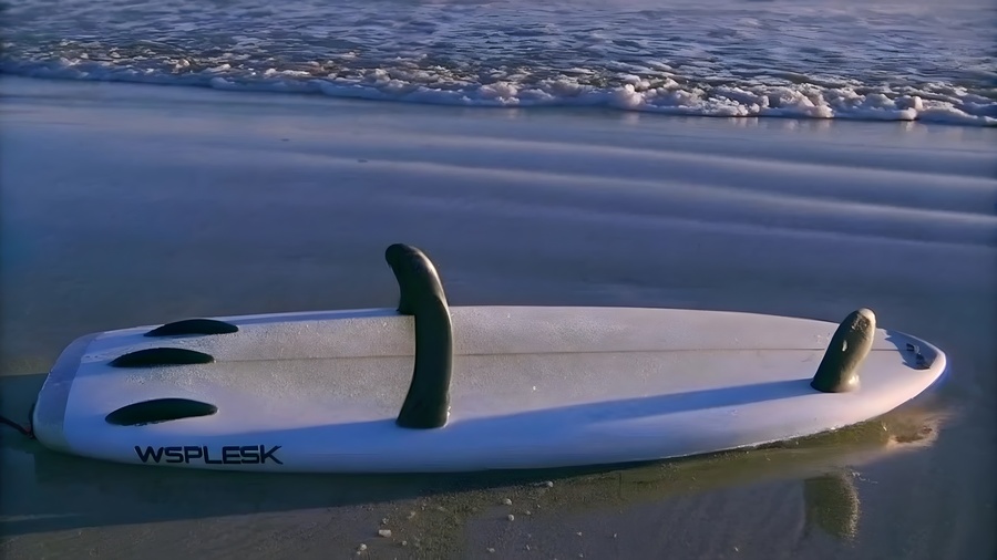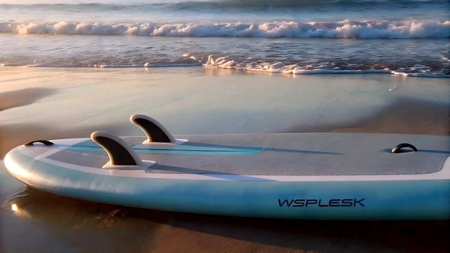 ПРОМПТ: A modern, retro-futuristic inspired surfing board lying on a sandy beach in sunny weather, clean and minimalist design, body color gray with a bright light-blue strip running along the side, nose and fin in light-blue, cutouts on both sides with two handles for carrying, top surface covered with dark grey waterproof non-slip material, logotype in sans-serif font reading «WSPLESK» in the left-hand lower corner of the board, vibrant sunlight casting shadows on the sand, calm ocean in the background.