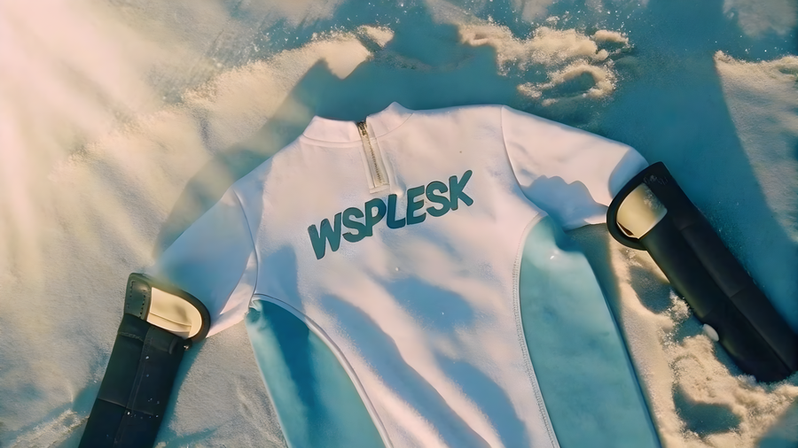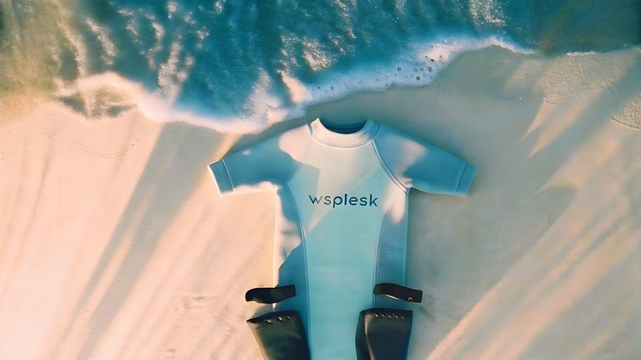 ПРОМПТ: A top-down shot of modern, flat-lay composition, retro-futuristic inspired surfing suit, clean design, body color light blue, shin and wrist guards light gray, knee guards black, a black logotype that reads «WSPLESK» in a modern sans-serif lowercase font is featured on the suit, sand in the background, sun rays shining through.