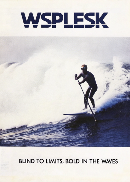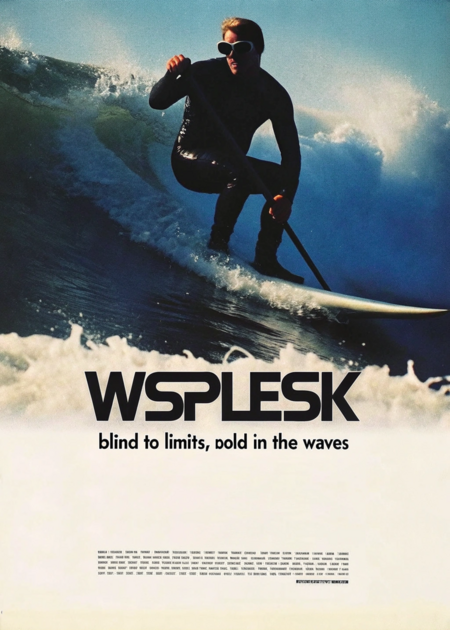 ПРОМПТ: An illustrated modern retro poster, a surfer in black non-see-through googles riding the waves, the surfer is holding a cane, features a logotype «WSPLESK» in a sleek sans-serif modern lowercase font, with the tagline «Blind to Limits, Bold in the Waves»
