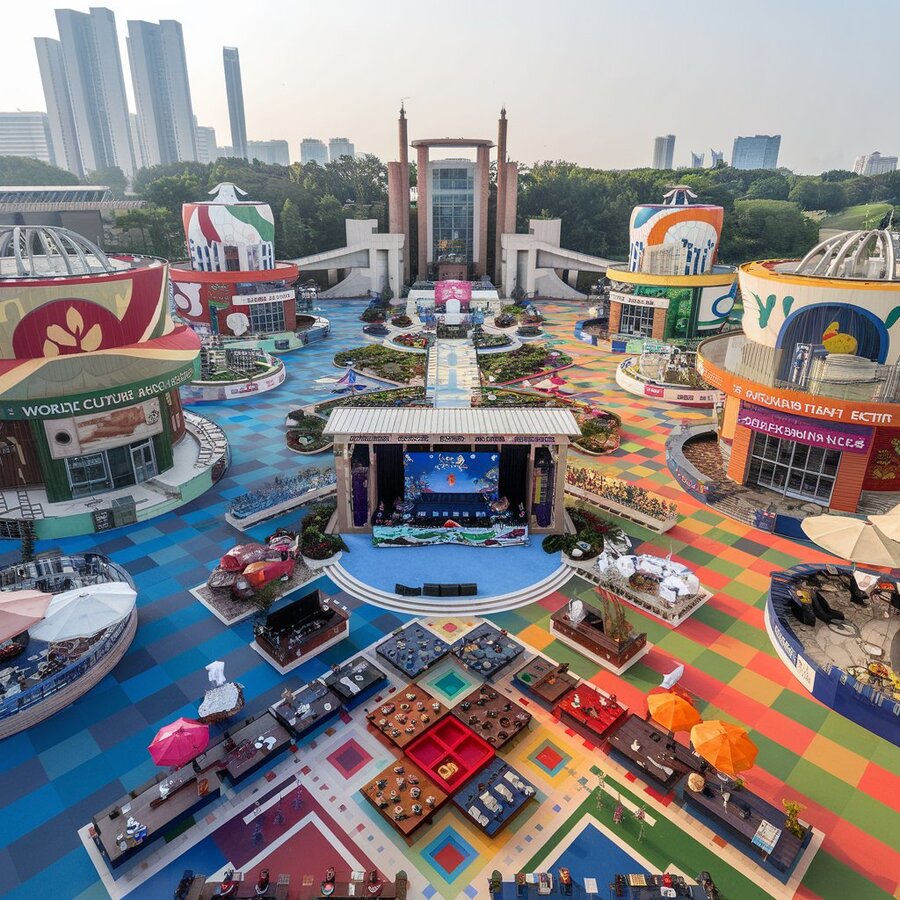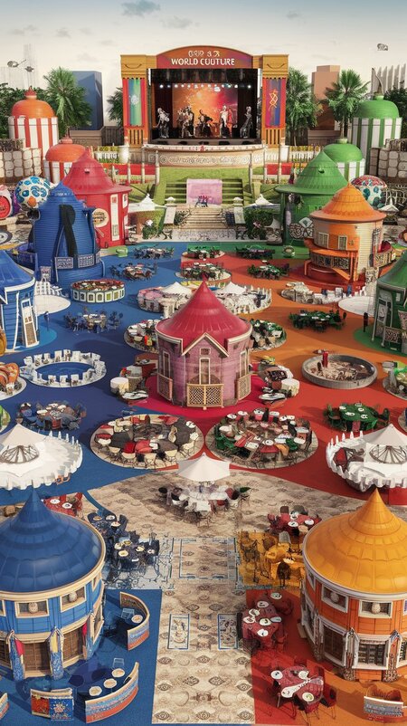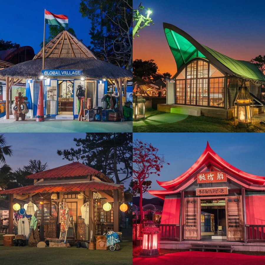 Использованные промты: - Show how the Global Village exhibition would look like. According to the idea, each participating country erects its own pavilion on the territory, which should introduce the visitor to the life and cultural traditions of its people, demonstrate and offer ethnic attributes, outfits, goods and souvenirs. During the evening entertainment shows, illusionists, musicians and comedians perform on the World Culture Stage. The fair also features attractions for the whole family. Numerous restaurants, cafés and street food stalls offer international specialities. - Show how the pavilions of the Global Village exhibition will look like. According to the idea, each participating country erects its own pavilion on the territory, which should familiarise visitors with the life and cultural traditions of its people, demonstrate and offer ethnic attributes, outfits, goods and souvenirs.
