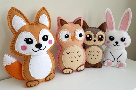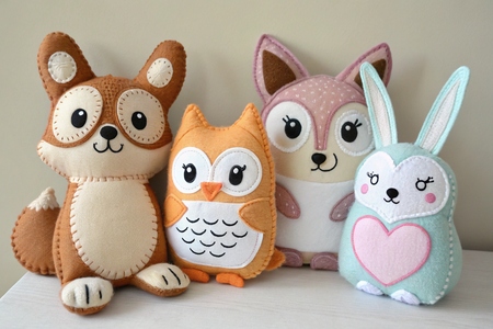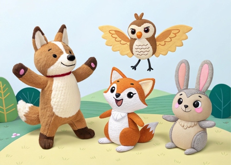 Prompt: Generate an image of four plush toys: a corgi, an owl, a fox, and a bunny. They should have a simple, cute design with large, embroidered eyes and soft, rounded shapes. The plush toys are arranged together, as if for display, and are made of various soft, colorful fabrics. The style should be charming and appealing to young children. The background should be plain and neutral to focus on the toys.