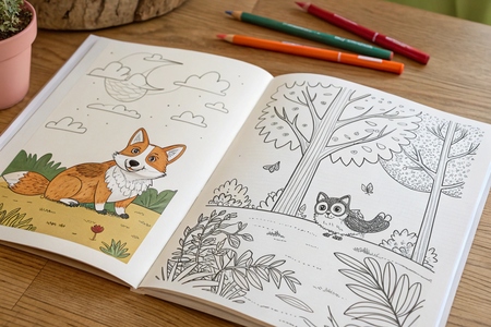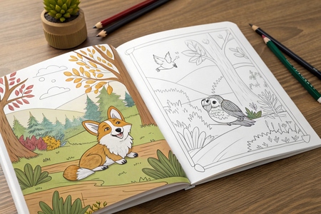 Prompt: Generate an image of an open coloring book lying on a wooden table. The left page is a completed, vibrant coloring illustration of a corgi, an owl, and a fox playing in a forest glade. The right page is the same scene as a black-and-white line art illustration, ready for coloring. The pages should look realistic with clear black lines and a slight paper texture. The overall scene should be well-lit, with the focus on the open pages of the coloring book.