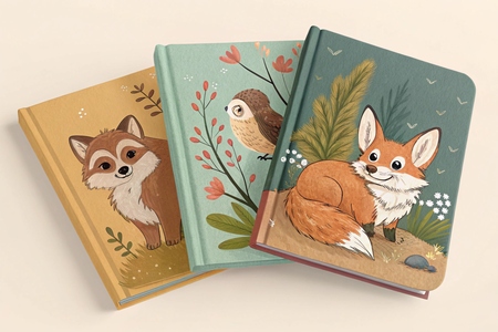 Запрос для ChatGPT: напиши промпт на английском для генерации книг с детскими иллюстрациями с корги, совой и лисенком.