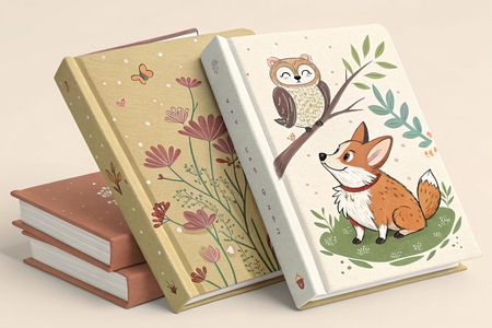 Promt: Generate a two-page spread for a children’s adventure story. On the left page, a corgi is leading the way through a dense forest. On the right page, an owl is flying overhead, guiding them, and a fox is following closely behind, sniffing the ground. The illustration should be vibrant and dynamic, with bright colors and detailed surroundings. The characters should have expressions of curiosity and excitement. The style should be engaging and lively, suitable for an action-packed story. Use a hand-drawn, colored pencil style.