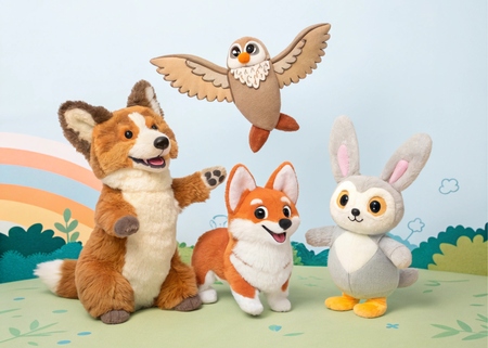 Prompt: Generate an image of four plush toys in playful, dynamic poses. A corgi is sitting upright, the owl has wings slightly outstretched as if it’s about to fly, the fox is in a leaping pose, and the bunny is sitting with its ears perked up. These plush toys should have a soft, fabric feel with embroidered details and vibrant colors. The background is a simple, colorful setting that complements the toys. The overall feeling should be energetic and fun.