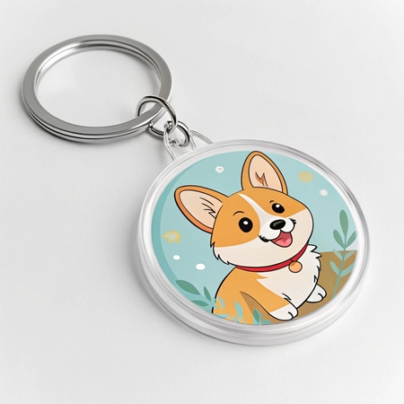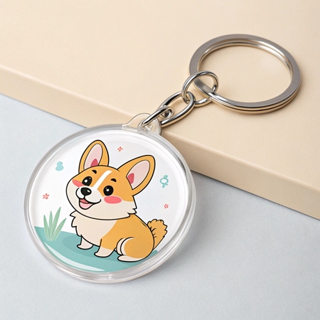 Prompt: Generate a mockup of a simple acrylic keychain featuring a cute corgi design. The keychain is circular or rectangular, with a clear acrylic surface and a key ring attached. The corgi illustration is bright and colorful, printed inside the acrylic. The mockup should look realistic with reflections and a simple, neutral background to showcase the keychain clearly. The overall feel should be clean, modern, and appealing to children.