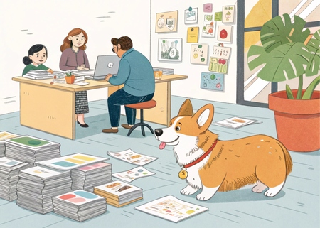 2. Create an image of a busy editorial office at a children’s book publishing house where a corgi is the mascot. The scene should show several people working at their desks, surrounded by manuscripts and artwork. The corgi is actively involved, perhaps sitting calmly at a meeting table, ‘inspecting’ new illustrations on the floor, or gently nudging someone’s hand as they type. The style should be lively and professional, capturing the dynamic energy of a publishing house while also showing the corgi’s integral role.