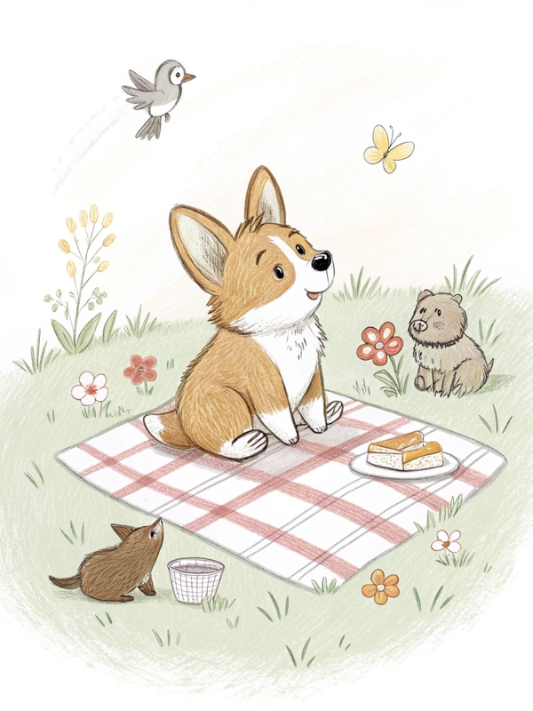3. Generate a promotional illustration for a children’s book series featuring Lulu the corgi, a fox, an owl, and a bunny. The illustration depicts the four friends gathered together in a cozy setting, perhaps sharing a picnic blanket under a tree or huddled by a warm fireplace. The style should be soft and inviting, with gentle colors and a focus on the characters' friendly expressions. The overall feeling should evoke warmth, friendship, and the joy of storytelling.