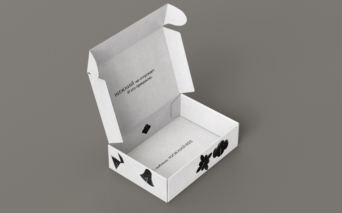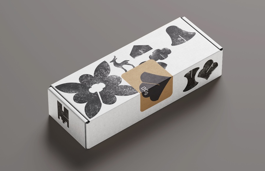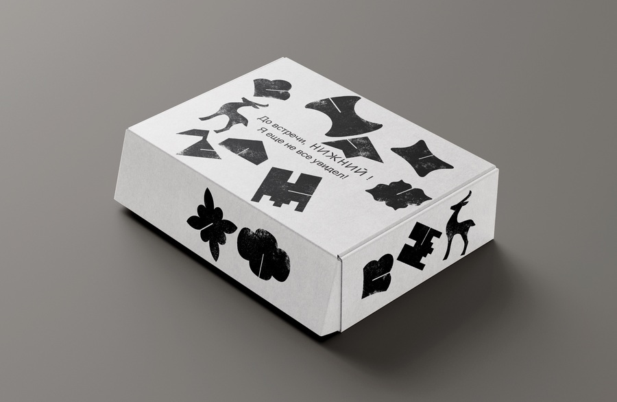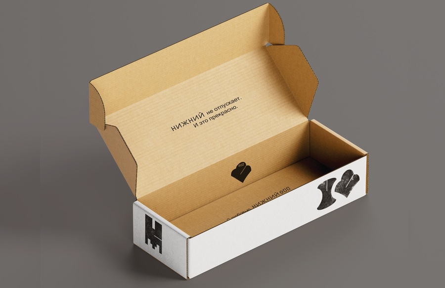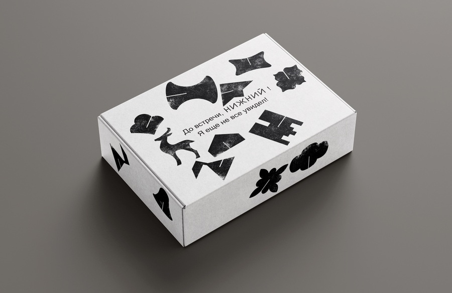 Furthermore, on some media, the logo or graphic elements are embossed. This tactile solution appeals to the human psyche, immersing the user in an atmosphere of authenticity and creating a sense of historical depth, while avoiding visual noise and emphasizing the handcrafted elements. The main graphic element is the logo, which interacts with the audience: like the store itself, it was established in the context of the city’s eight-hundredth anniversary, when many architectural landmarks were built and restored. Product packaging is made of cellulose cardboard, an environmentally friendly material. The front of the packaging features embossed icons imitating the textures of Nizhny Novgorod’s architectural symbols.