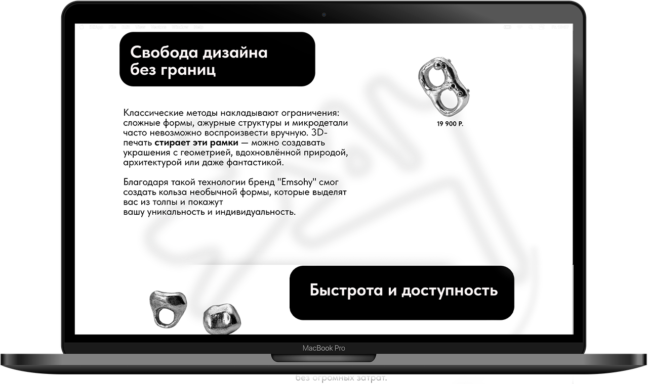Поп-ап Emsohy — это точка соприкосновения природы и технологий. Текучая смола, индустриальный металл и 3D-печать соединяются здесь в одном моменте — будто украшение только что родилось. Это про красоту перехода: между жидким и твёрдым, цифровым и ручным, хаосом и формой.
