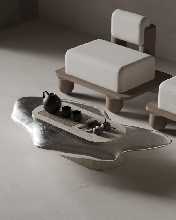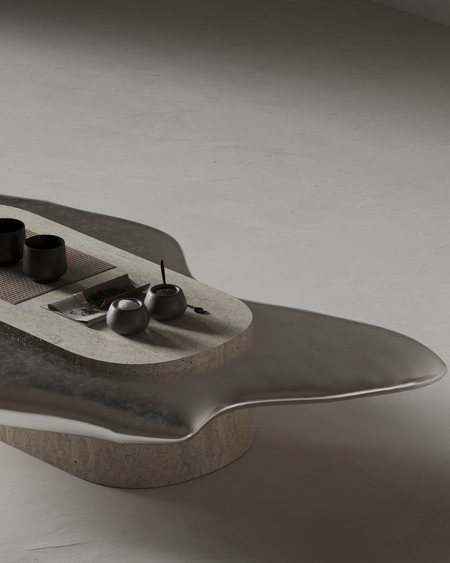 Стол в коллекции CHAI — провокация и вызов скучной реальности: кажется, что столешница, словно расплавленный металл, разрезала на две части каменное основание из дербентского ракушечника и застыла в воздухе.