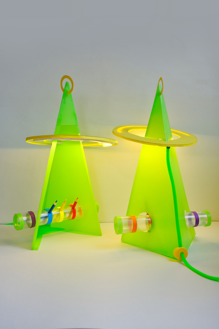ДЕТСКИЙ СВЕТИЛЬНИК — КОНСТРУКТОР ЛЕТО, предлагается как конструктор «собери сам». Состоит из полупрозрачного цветного корпуса — пирамиды (листового пластика), отражателя в виде кольца со светодиодной лентой, и поперечного цилиндра, выполняющего роль крепежа- стяжки. Наверху пирамиды расположено кольцо, что позволяет светильник сделать подвесным. Все элементы светильника: развертка корпуса, световое кольцо — отражатель, крепежно-стягивающий элемент цилиндр располагаются в развертках на листе бумаги размером 600 × 400, которая является элементом упаковки и описания сборки светильника, там же расположен и адаптер. Светильник может использоваться как настольный так и подвесной т. к. наверху пирамиды корпуса расположено кольцо для подвески. Световой элемент светодиодная лента, расположена на кольце отражателя. Напряжение 12v, что безопасно для детей. Изготовлено автором