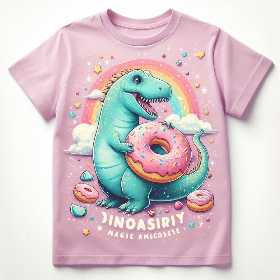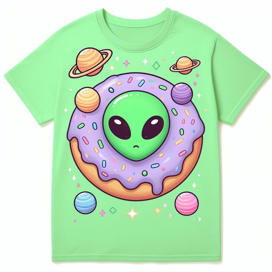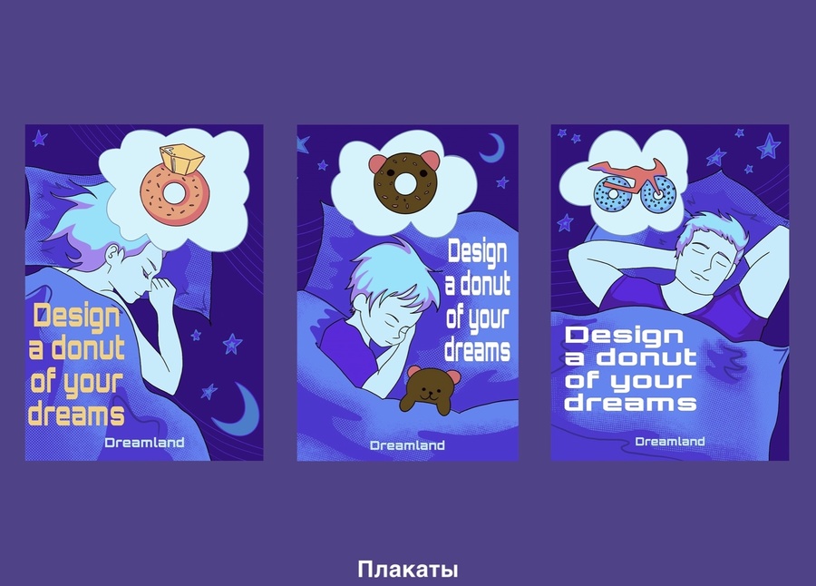 На основании айдентики я сделала постеры и мерч: dreamy and magical donut store promotion poster with pastel colors and the text «create a donut of your dreams» — DALL·E 3 футболка с принтом зеленого инопланетного пончика, пастельные цвета, сказочная атмосфера, инопланетянин в дизайне пончика, разные планеты в качестве топпинга на глазури, без фона — DALL·E 3 футболка с принтом пончика зеленого цвета с головой динозавра, стилистика нежная и волшебная — DALL·E 3
