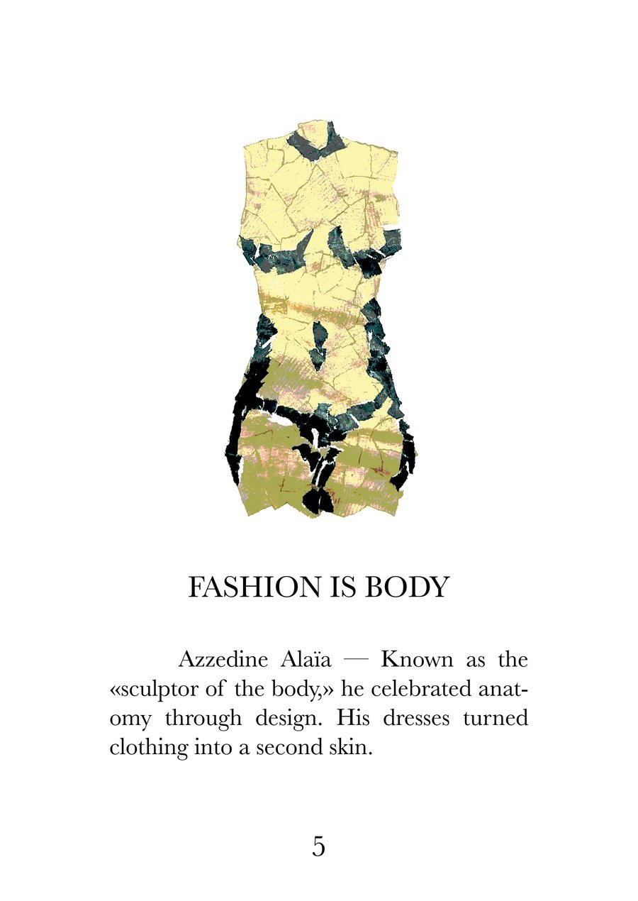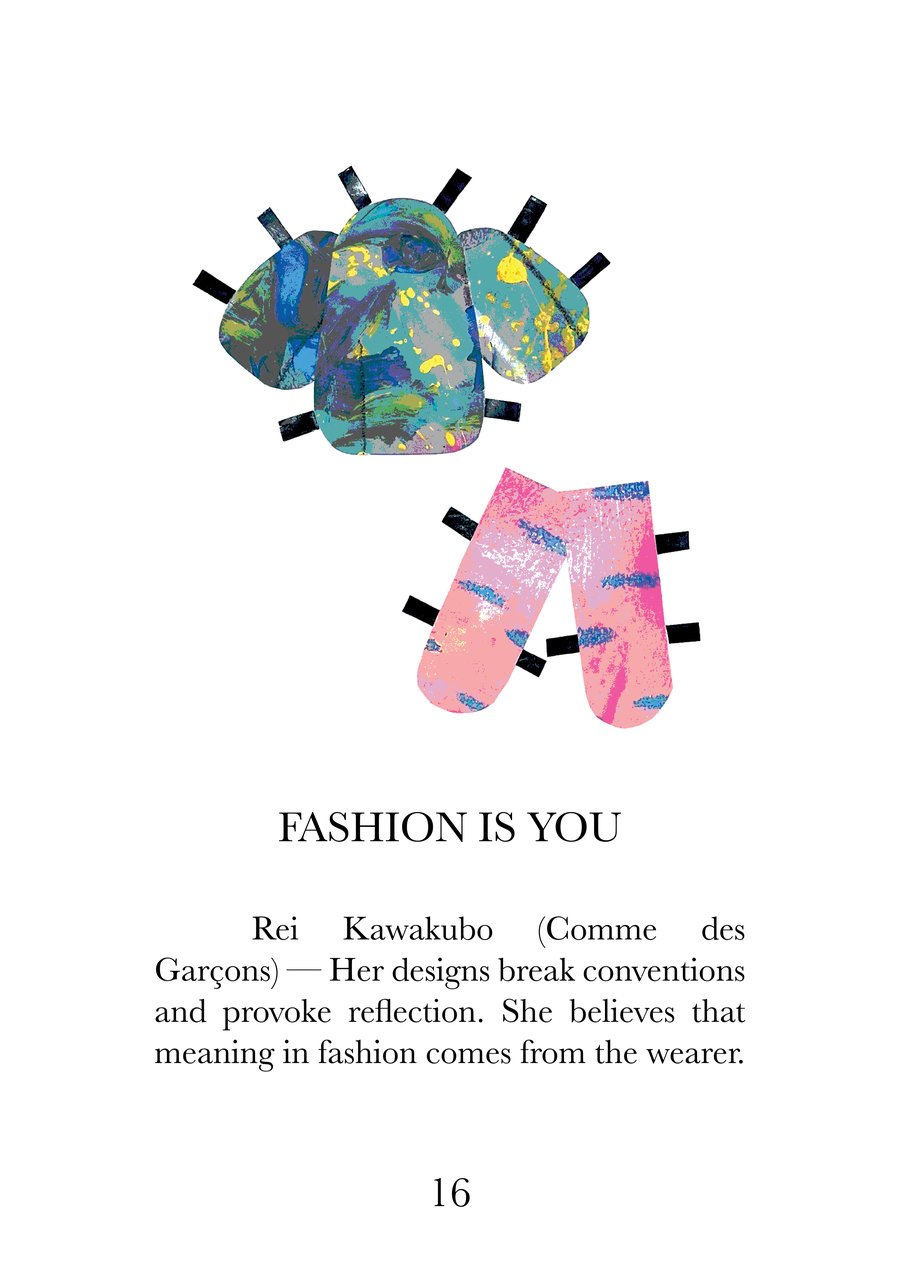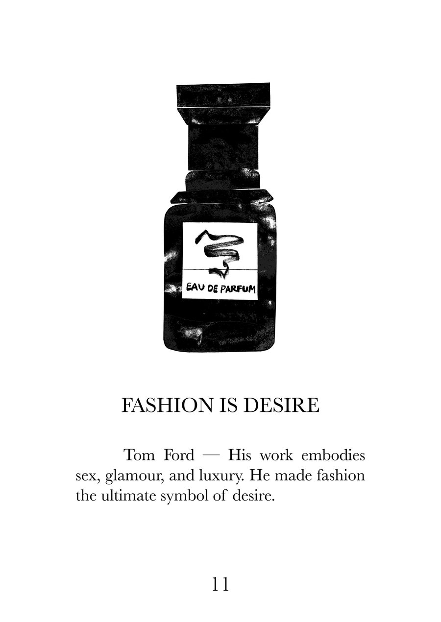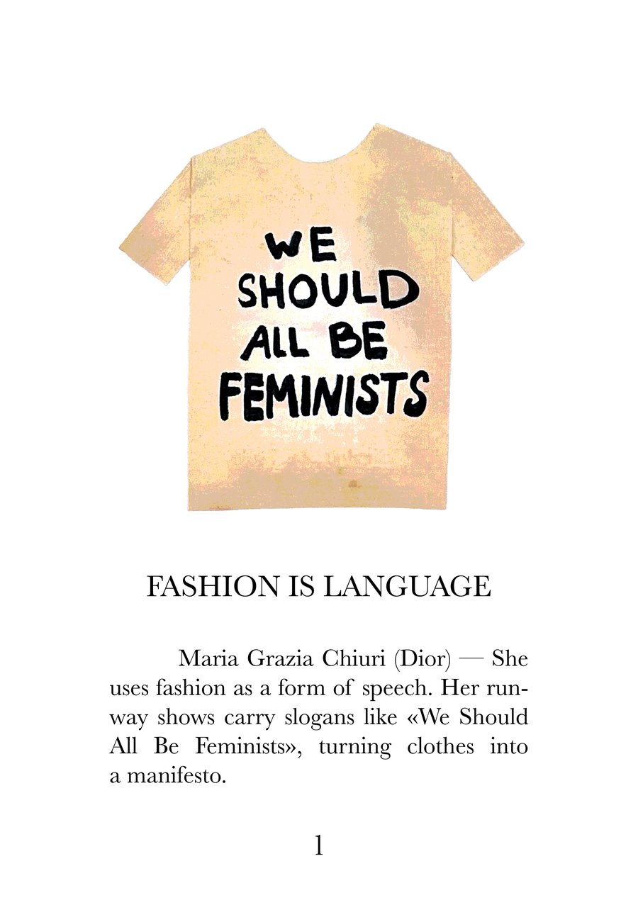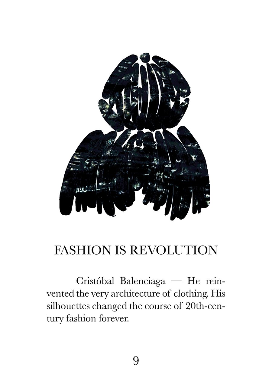 Эта книга — визуальный и текстовый манифест, собрание из 16 высказываний о моде, исследующих суть одежды как языка культуры, идентичности и эмоций. Каждая страница соединяет сильную фразу с именем дизайнера, воплощающего её смысл, создавая диалог между словами, историей и визуальной формой.
