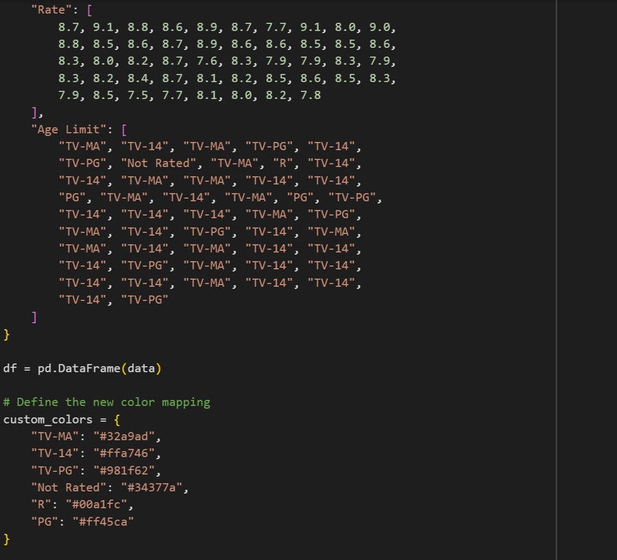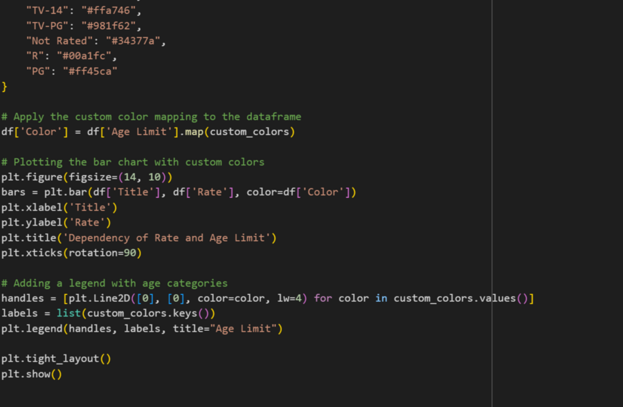 Линейная диаграмма, представленная скриншотом, показывает зависимость уровня оценки от возрастного рейтинга. Так, наиболее высокое признание получают тайтлы с рейтингом PG, являясь более доступной зрителям с точки зрения понимания.