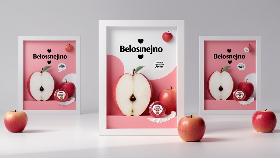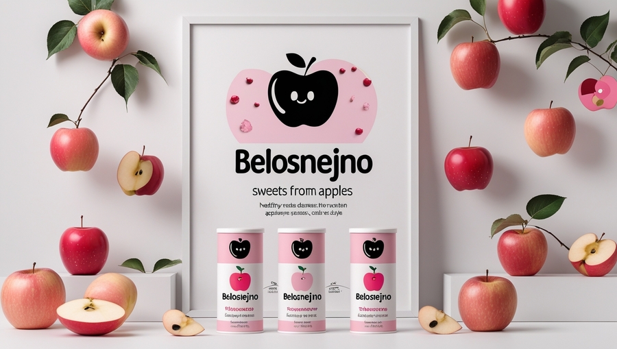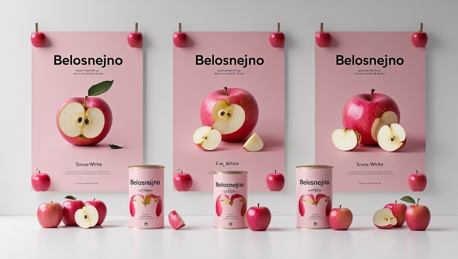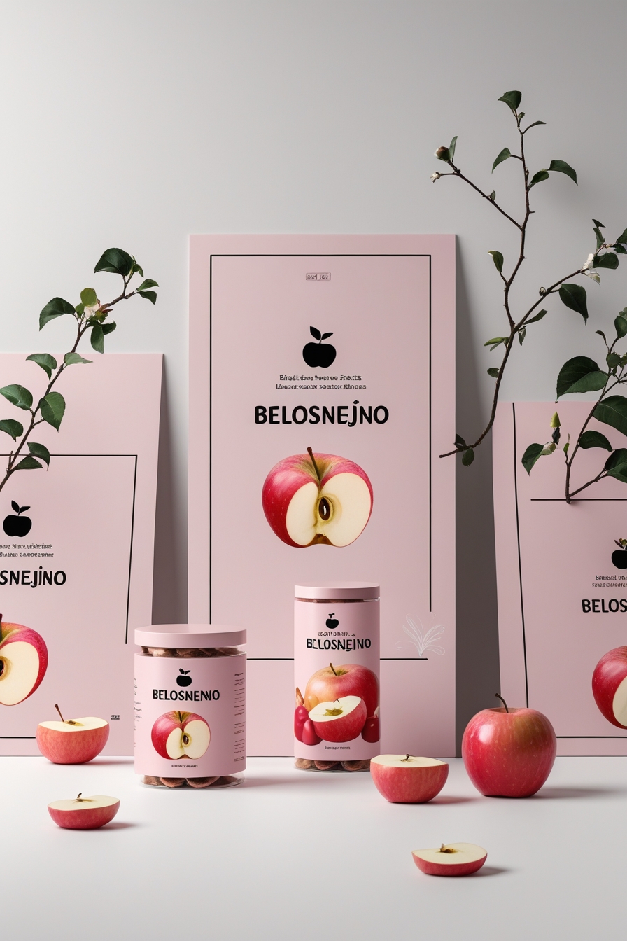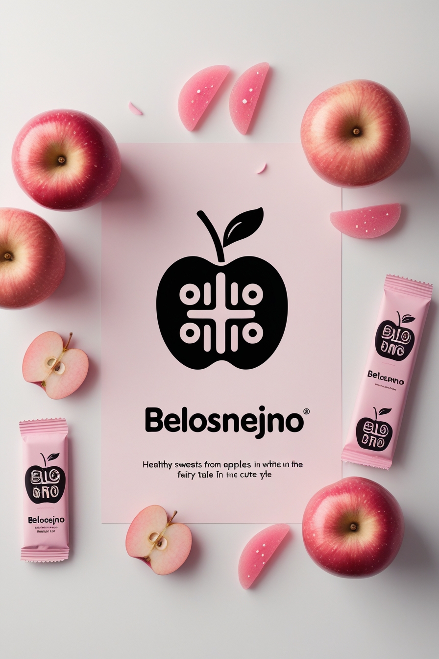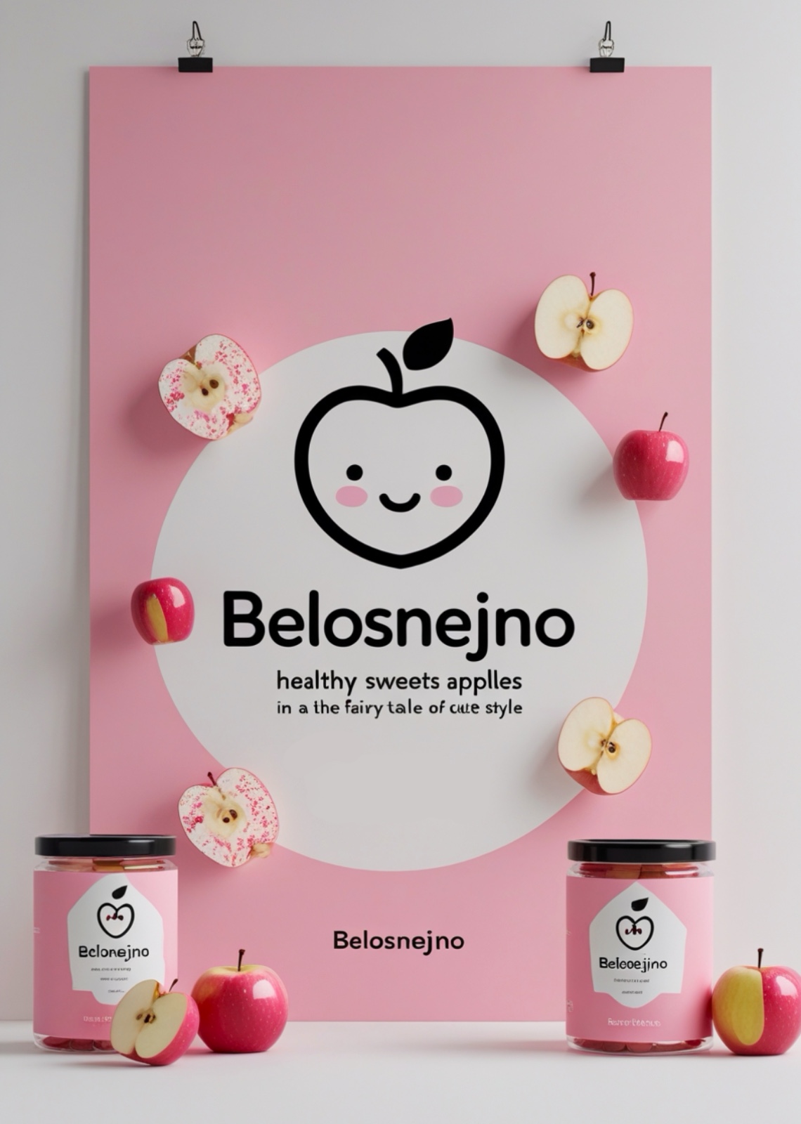 leonardo ai prompt/ Realistic photo of advertising posters in a minimalistic design with the black Belosnejno logo of the Belosnejno brand, which produces healthy sweets from apples, with the style of the fairy tale Snow White in a cute style. Using pink colors. Products on a white background/