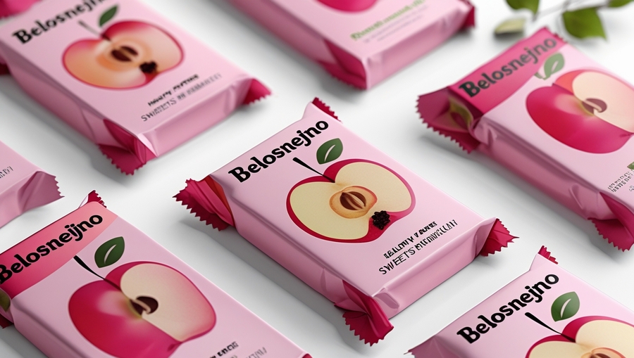 leonardo ai prompt/ Realistic photo of candy bar packages in a minimalistic design with the black Belosnejno logo of the Belosnejno brand, which produces healthy sweets from apples, with the style of the fairy tale Snow White in a cute style. Using pink colors. Products on a white background/