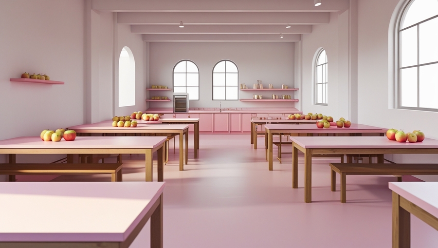 leonardo ai prompt/ A realistic space of the brand’s factory that makes healthy sweets from apples. The walls are white, with kitchen tables with light pink countertops, clean apples. The interior is designed in a minimalist style/