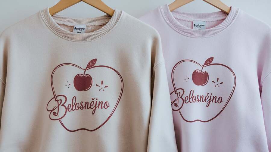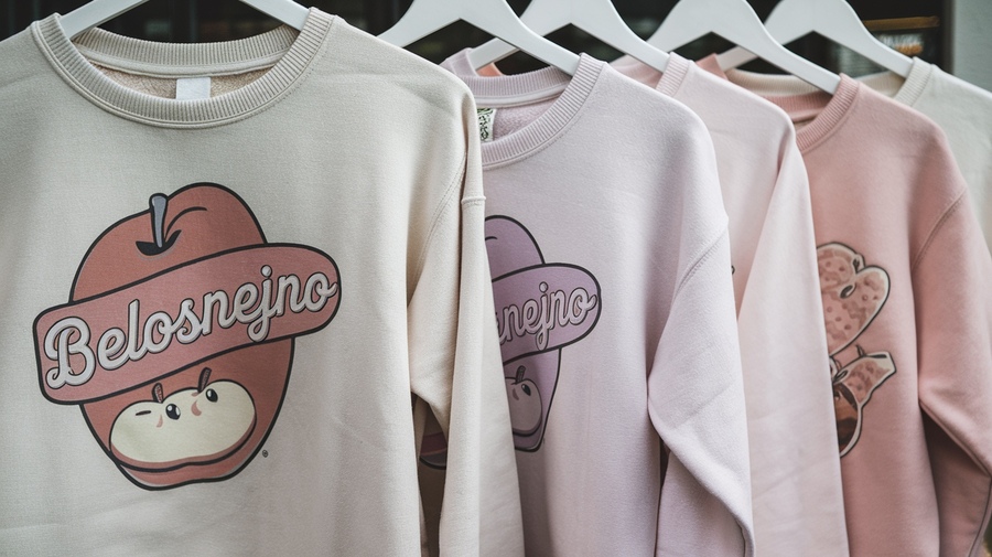 ideogram ai prompt/ A photo of beige and light pink sweatshirts on hangers with the logo «Belosnejno». The logo is in the style of the fairy tale «Snow White», with an apple and the text «Belosnejno». The sweatshirts are in the minimalistic and cute style, with light shades of beige and pink. The background is white/