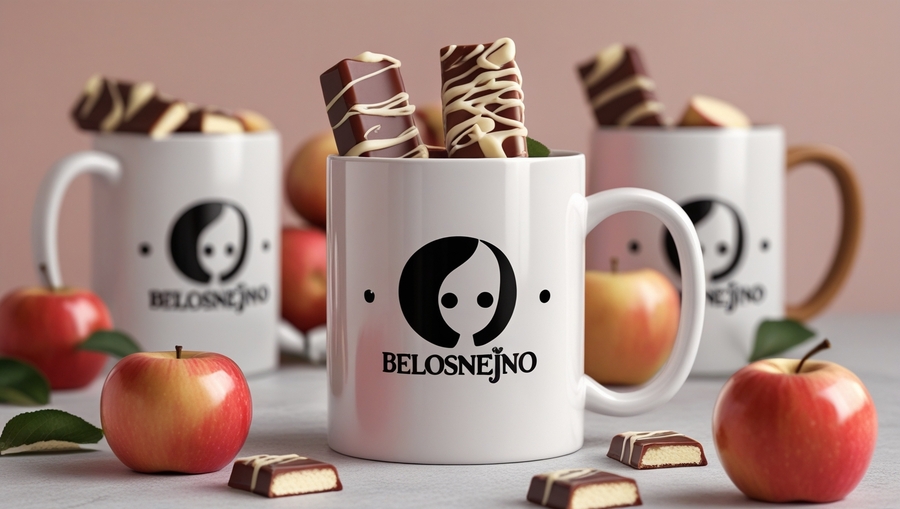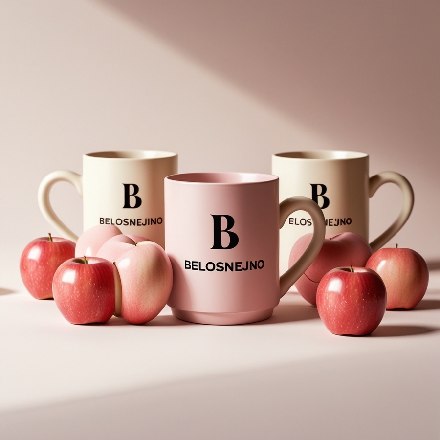 leonardo ai prompt/ A high-contrast, realistic photograph of a set of pastel pink and beige ceramic mugs arranged in a clean, minimalist composition, featuring the distinctive Belosnejno logo in bold, black font, reminiscent of the whimsical illustrations from the classic fairy tale Snow White, with a touch of cuteness and playfulness, surrounded by a few juicy, red apples with subtle highlights and soft shadows, evoking a sense of warmth and coziness, with the logo’s clean lines and modern typography juxtaposed against the vintage-inspired, fairy tale aesthetic, creating a captivating visual harmony/