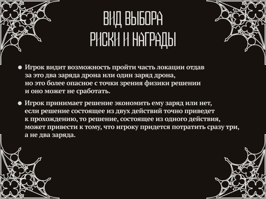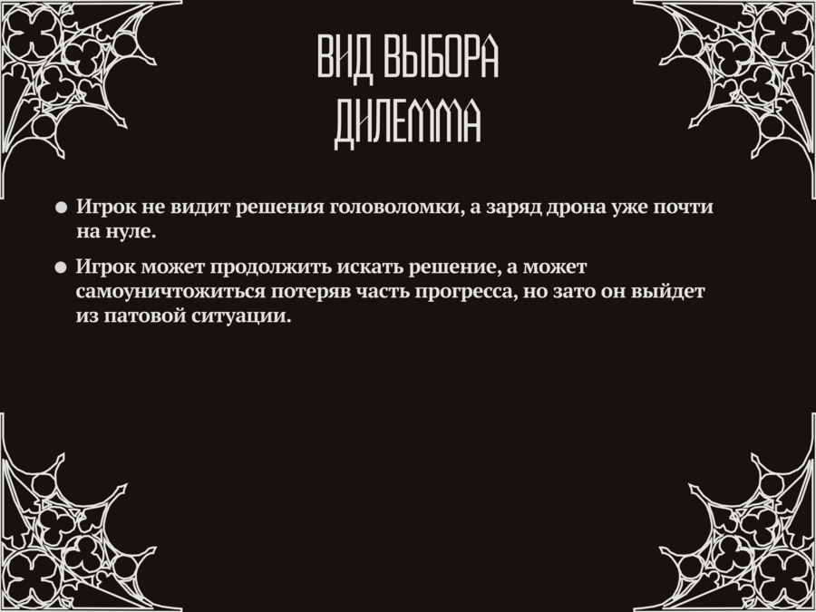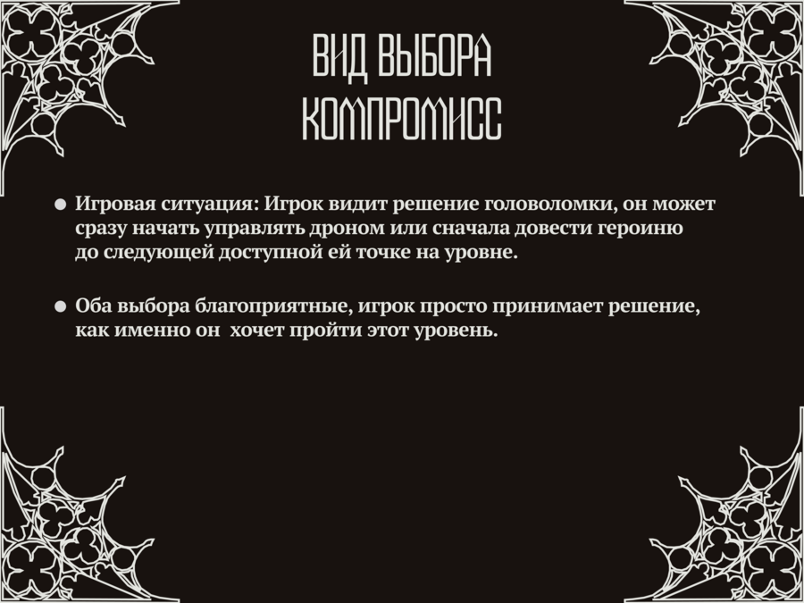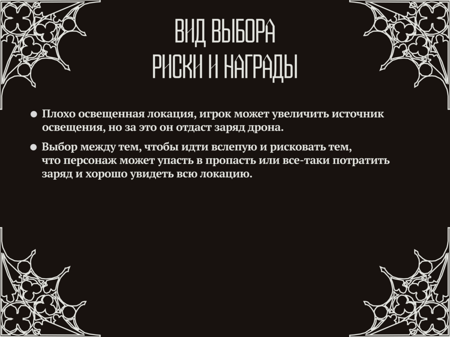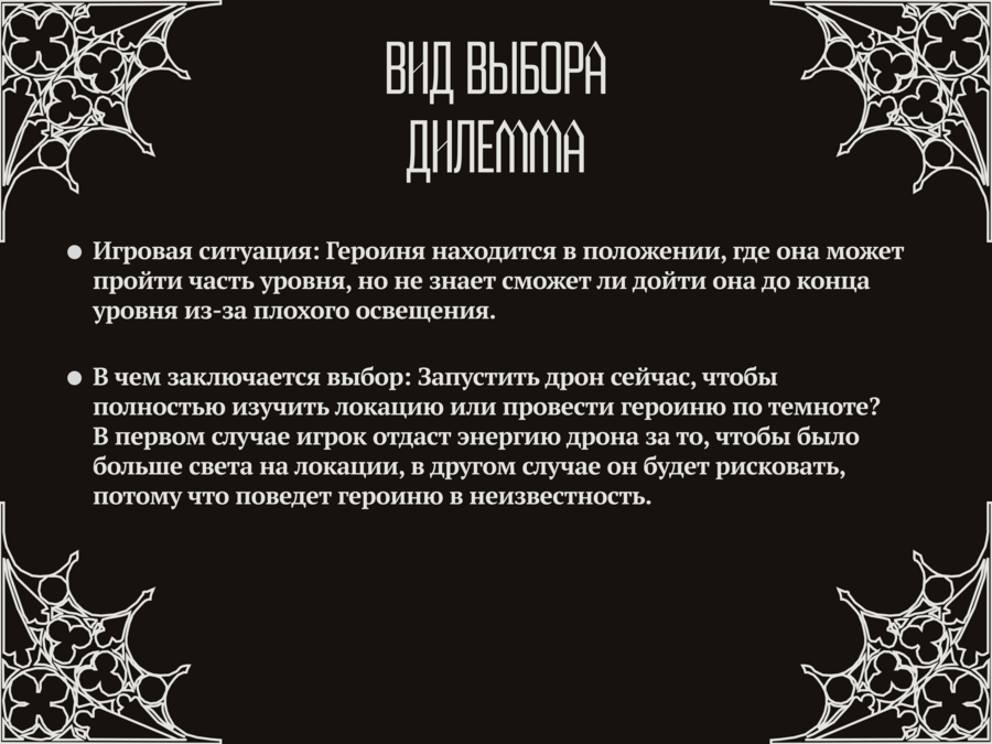 Чем дальше проходит игрок, тем больше и сложнее выборы встают перед ним. Некоторые выборы могут объединяться, например можно соединять выбор между светом и тьмой и выбор между рискованным прохождением и спокойным.