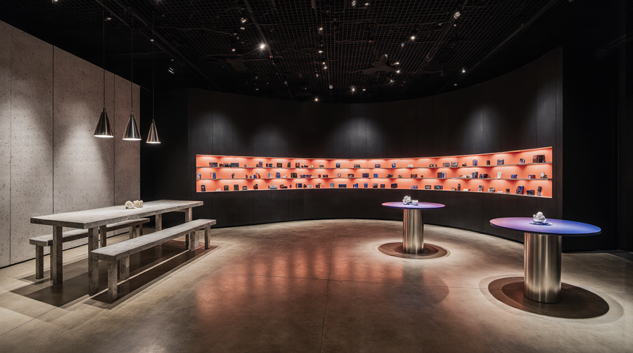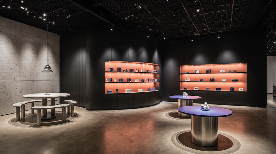 3. Пространство бренда было сгенерировано в Krea. Промпт: create A contemporary minimalist showroom interior, featuring a division of two zones. On the left, a light gray concrete table and benches set on a matte tile floor, illuminated by modern industrial pendant lights. On the right, dark metallic walls and floor, with a wall display of deep red illuminated shelves holding small objects (such as blue cameras from previous generations). Two round metallic display tables with blue tops are in the foreground. Lighting is soft and geometric, ceiling is a grid pattern, overall ambiance is sleek, modern, and meticulously arranged, balance of neutral grays and bold blue and white accents, no people. — just like in previous generations, but make it from different angles.