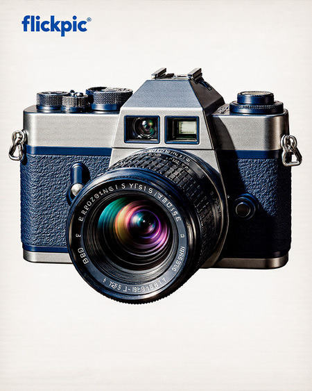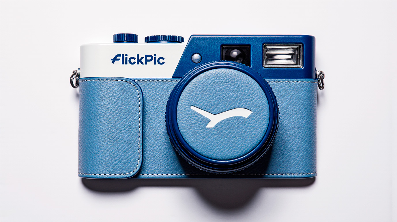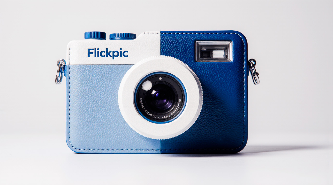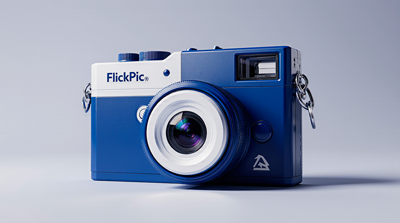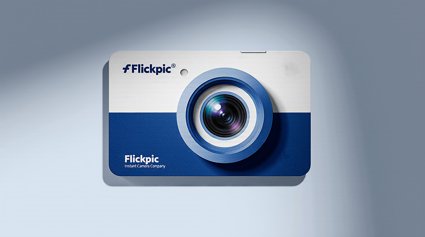 2. Логотип был сгенерирован в Krea. Промпт: generate a minimalistic vector shaped text logotype for flickpic — brand of portable instant cameras as a base for the shape of the logo use the shape of squared blue-colored camera with round lens. duplicate the text on the shape itself below the shape of the logotype in order to have an example of the font.