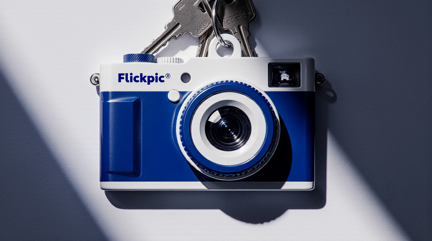 6. Носители (визитки, брелки, чехлы, картриджи) были сгенерированы в Krea. Промпты: 1) generate a hyperrealistic image of a business card with flickpic logo on it (attached image*) also in the same font write infromation about the company: instant camera company: flickpi.co. 2) generate a hyperrealistic image of glossy plastic keychain hanging from a pair of keys in the shape off the flick pic logo (attached image*). 3) Generate a hyperrealistic image of a leather camera case with flickpic logo printed on it (attached image*) the blue-leathered case sould be in somewhat square-shaped and lay on the soft white background. 4) Generate a hyperrealistic image of a square package of square paper cartridges for instant printing of the photos out of the cameras with the flickpic logo printed on it (attached image*). The package itself should look glossy and blue colored.