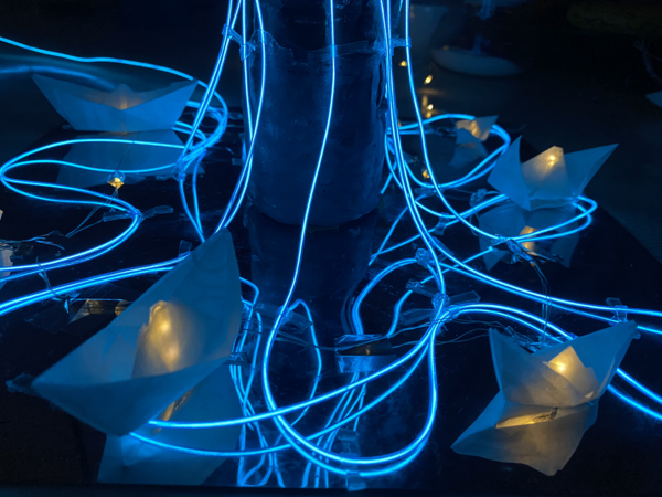 У основания башни расположена зеркальная поверхность, создающая иллюзию водного пространства. По нему медленно «плывут» бумажные кораблики с мягким внутренним светом, обращаясь к историческому контексту —в апреле 1919 года князья Юсуповы навсегда покинули Россию на борту английского миноносца «Мальборо». Тем самым башня становится связующим звеном и олицетворением данной истории.