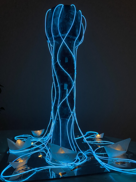 Прошлым башни является хранение воды и воспоминаний. Водные потоки, спускающиеся из резервуара и окон неоновым светом олицетворяют память и время, когда башня еще была действующей. Свет от неона имитирует движение, превращая архитектурный объект в источник пути, начало странствия.