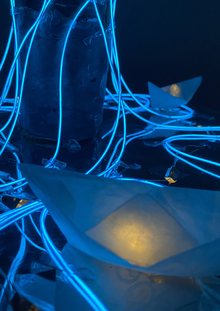 Инсталляция соединяет личное и историческое, архитектуру и свет, реальность и отражение. Путешествие здесь — не только географическое перемещение, но и обращение к сущности, внутренний и исторический переход, момент, когда прошлое медленно растворяется, и наступает начало чего-то нового.