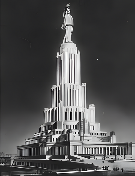 Здания сталинского ампира монументальны, высоки, с классическими пропорциями и симметричны. Это же есть и во входной группе Чёрной башни. По форме это цилиндр, с вырезанным полуциркульным углублением, а также с колоннами. Такие полуциркульные элементы (которые обращены вогнутой частью к зрителю) с колоннами можно увидеть в главном павильоне ВДНХ или на макете Дворца Советов (возможно, создатели вдохновлялись и им, так как общий вид башни чем-то похож: несколько ярусов, цилиндрическая форма, стремящаяся в высь, только всё скромнее).