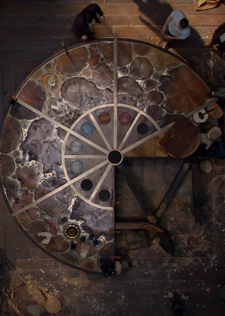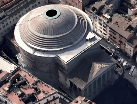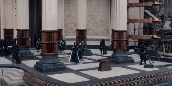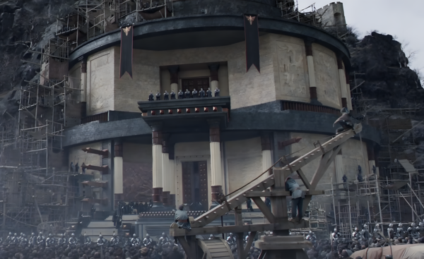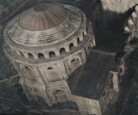 В комплексе есть сооружение, которое явно напрямую отсылает на Пантеон в Риме. Это здание — основное, где сидел Вортигерн и где ставит круглый стол Артур. Довольно интересный выбор для основного дворца: храм всех богов — храм всех королей — в нем сидели и правили совершенно разные люди (Утер, Вортигерн, Артур). А также это соответствует средневековому: вся власть королей от Бога (богов, в случае с языческим храмом), они наместники Бога на земле. Или, так как это римское сооружение, намек на то, как многие правители любили возводить родословную к Цезарю.
