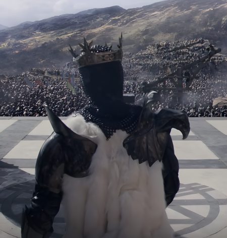 Также орла можно увидеть в качестве декоративного элемента у Вортигерна и некоторых легионеров на пелчевой части доспехов. И на различных гобеленах по всему фильму, на плахе. Орёл = военный и сакральный символ Рима, он показывает принадлежность Пендрагонов к Риму, их власть над Англией восходит к Риму.