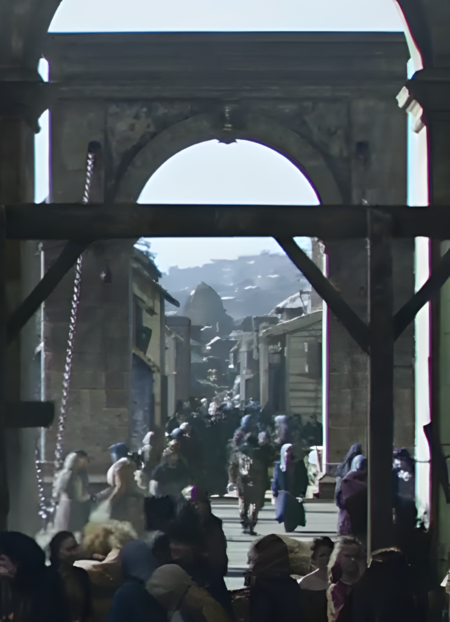 В городе сосуществуют два времени, два типа архитектуры: античность и средневековье. Одно представлено в виде темных, низких незамысловатых построек, другое — величественные, большие руины монументальных строений, которые сразу притягивают взгляд. Так, панорама города открывается с полуразрушенного виадука над рекой, по которой плывет лодка с маленьким Артуром. Виадуки и акведуки одно из узнаваемых сооружений античного Рима. Его же развалены проглядываются на фоне по всему городу на протяжении фильма. Также Виадук ведет к дворцовому комплексу.