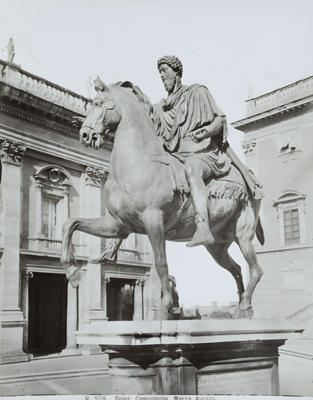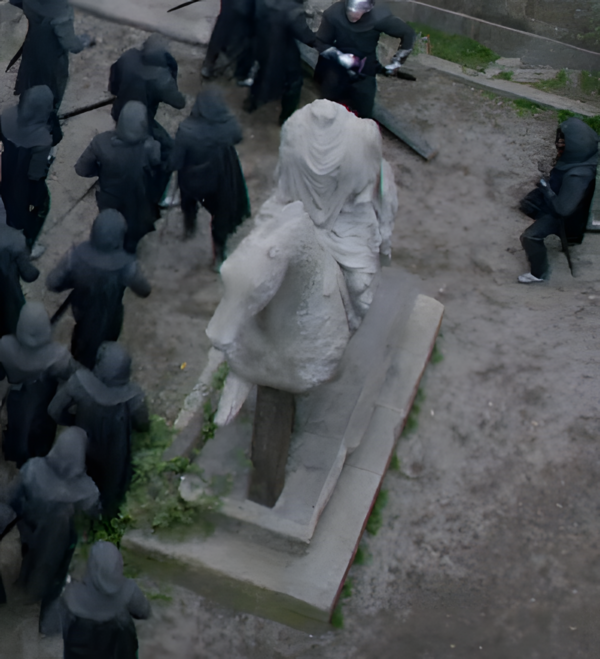 Еще одним элементом римской культуры является конный памятник. Конные памятники обычно ставили в честь правителей или выдающихся личностей где-нибудь, где его хорошо видно. Однако в фильме конный памятник обезглавлен (обезличен) и стоит в подворотне, где им некому любоваться, где он никому не интересен (скорее всего из-за того, что он был поставлен в честь какого-нибудь римлянина, который никого из жителей не волнует). Прототипом можно назвать конный памятник Марку Аврелию — один из самых известных римских конный памятников. Складки ткани на теле у обоих памятников очень похожи (кажется, оба носят плащ полудаментум), только в фильме всадник не вытягивает руку.