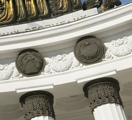 Колонны тоже сделаны интересно: имея каменные цоколь и базу, они продолжаются кованным металлическим элементом, после которого фуст колонны с каннелюрами. Капитель колонны симметричен нижней части, немного напоминает капитель колонн главного павильона ВДНХ, только вместо колосьев треугольные элементы с ромбами, опоясывающими их (это же верно и для вставленных колонн).