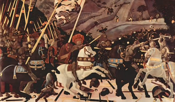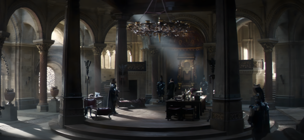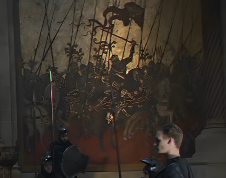 В тронном зале по бокам от входа можно заметить панно, на которых изображена битва. Битва, которая когда-то давно, скорее всего, была выиграна. Это иконография коллективной доблести. Подобное несложно найти в реальной истории, например, «Битва при Сан-Романо» Уччелло или серия картин Мантеньи с триумфами Цезаря. Это нужно чтобы создать правдоподобность пространства, что его не вчера построили для съёмок, а будто оно давно стоит, в нём запечатлена история, события, которые были до начала фильма.