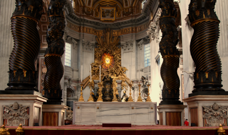Тронный зал находится в здании, напоминающем Пантеон. Он напоминает бронзовый киворий в соборе Св. Петра: те же четыре колонны (пусть и квадратные) перед полукруглой апсидой, то же возвышение. Витые колонны, составляющие аркаду, с коринфской капителью опоясывают тронный зал.