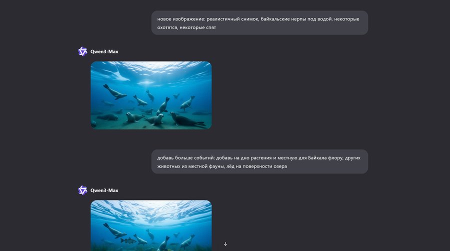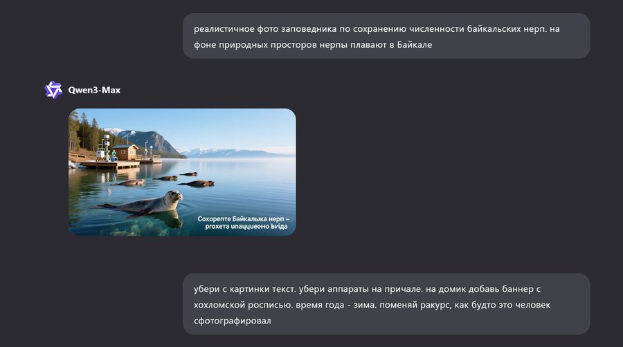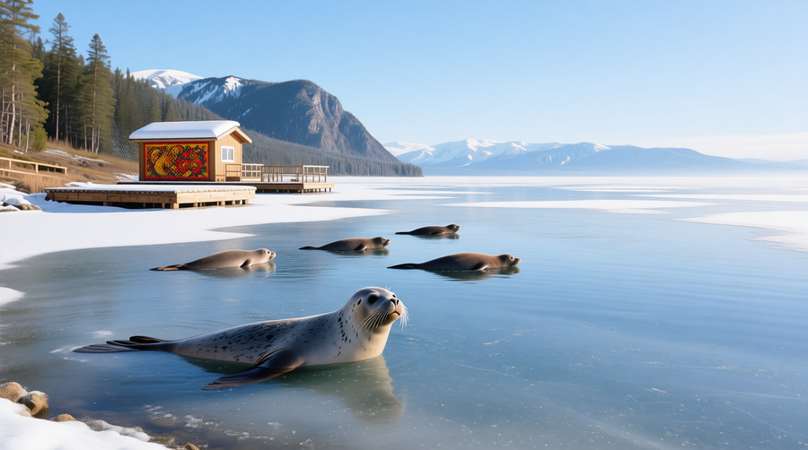 Изображение выше (Qwen): «Офис по продаже билетов в заповедник-нерпинарий, созданный, чтобы сохранить популяцию байкальских нерп. фирменный стиль заповедника — хохломская роспись».
