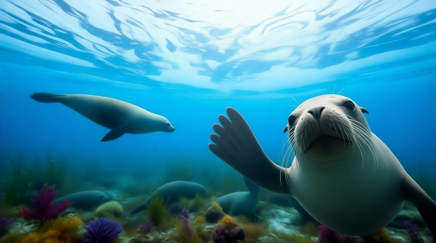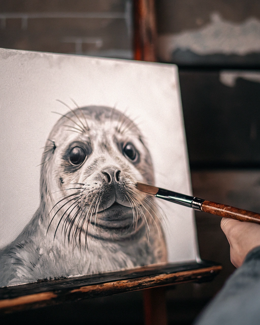 Промпт для правого изображения (ChatGPT): remove the crayon from the bottom right and add a porster-style text to this image so it looks like it’s a commercial poster for a Baikal seal conservation center called «Хохломская нерпа»