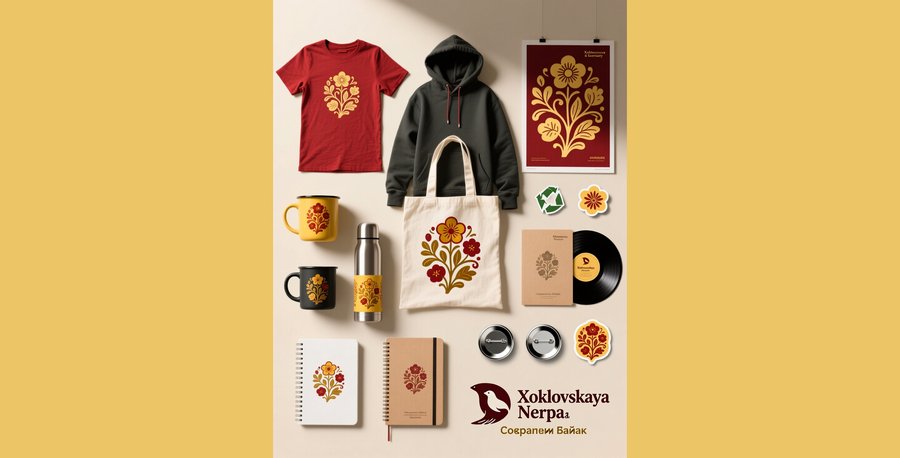 Серия мокапов мерча для заповедника-нерпинария «Хохломская нерпа». Современные, эстетичные изделия с экологическим акцентом и элементами хохломской росписи.