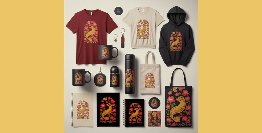 Показать разнообразие продукции: хлопковые футболки, худи, тканевые экосумки, кружки, термосы, блокноты, значки, постеры и наклейки. Цветовая палитра — B52026 EBC566 F8E4A9 00030A F0F0F2.
