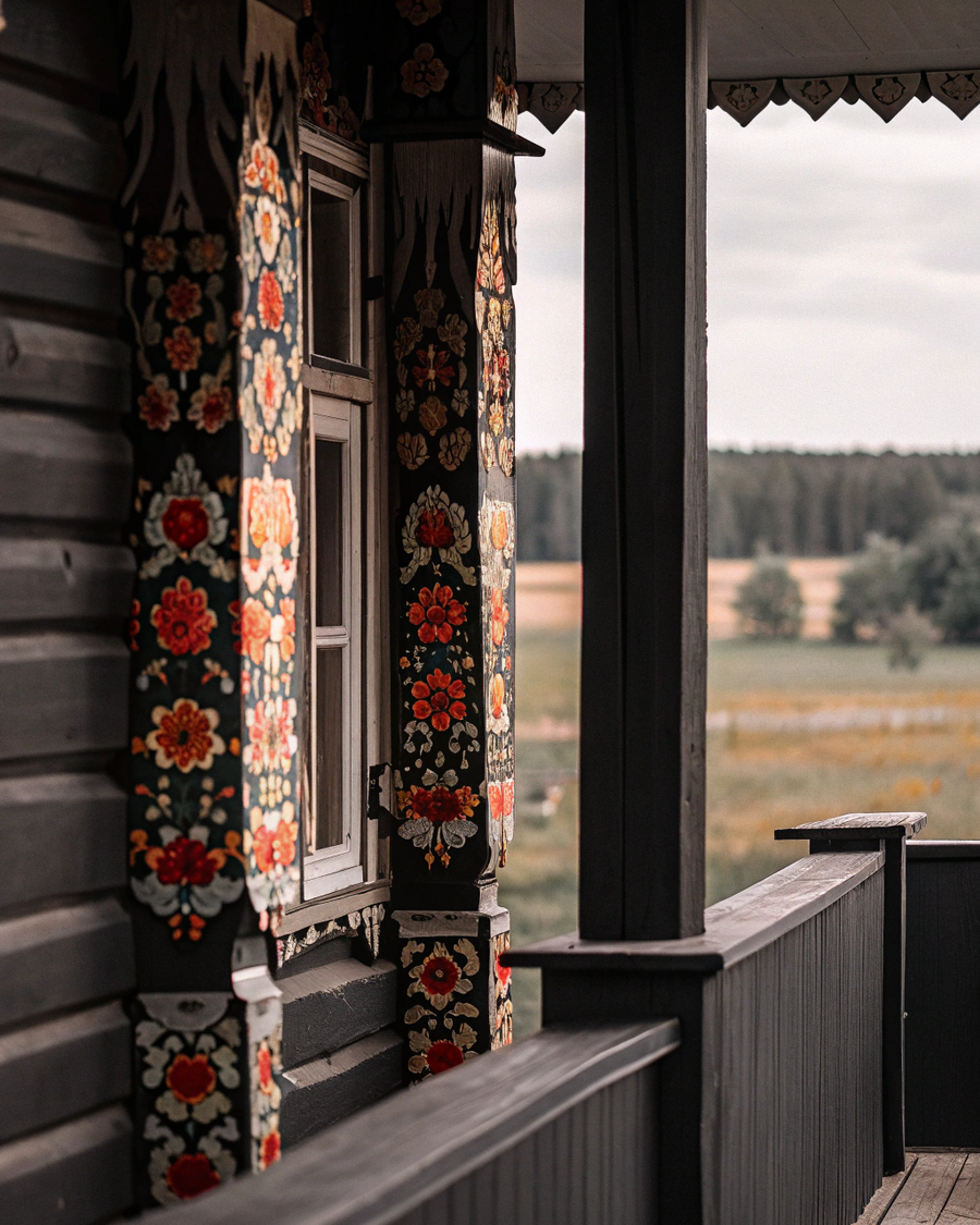 Изображение ниже (Qwen): «Столовая в заповеднике-нерпинари. заповедник создан, чтобы сохранить популяцию байкальских нерп. фирменный стиль заповедника — хохломская роспись».