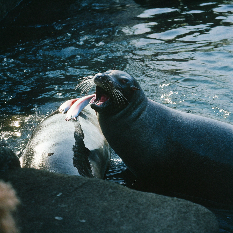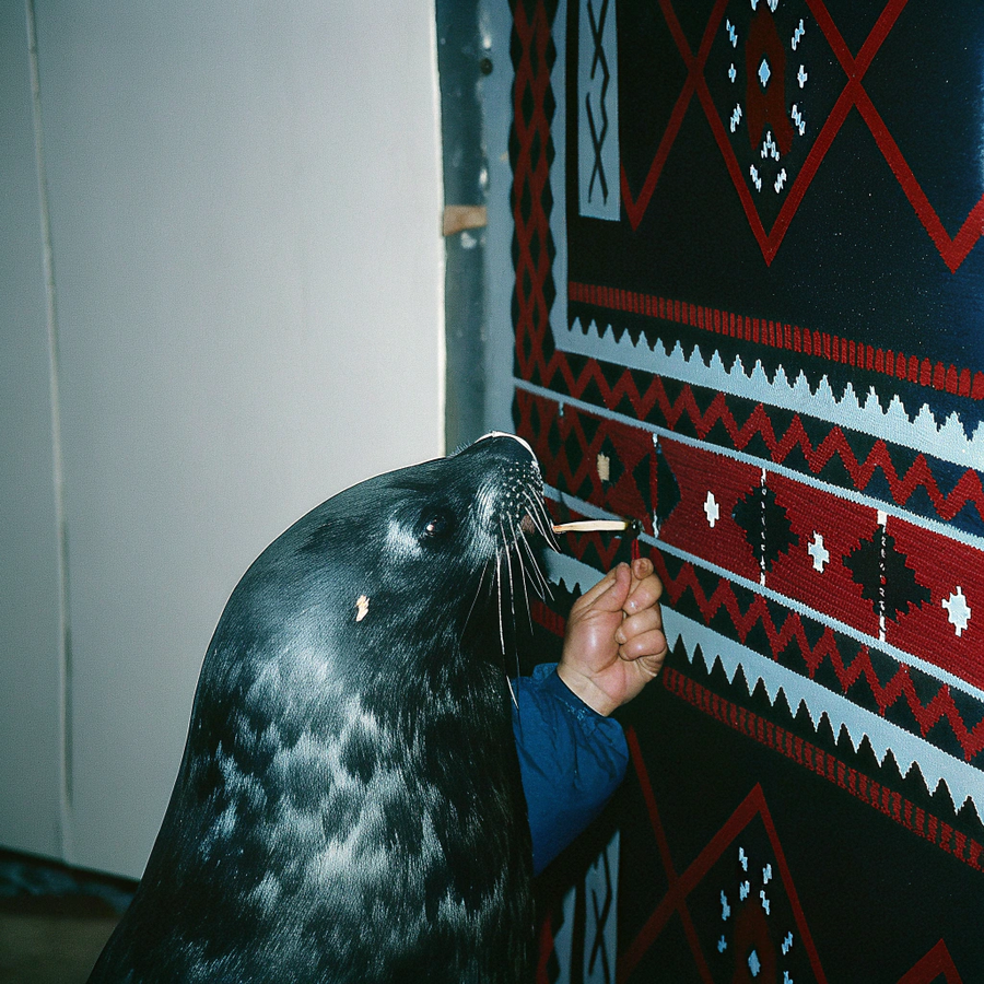 Промпт для ChatGPT: use the attached image and remove everything except the image of the seals inside the circle on the wall. make the circle with the seals even in perspective, so the final image can be used as a logotype for a Baikal seal conservation center.