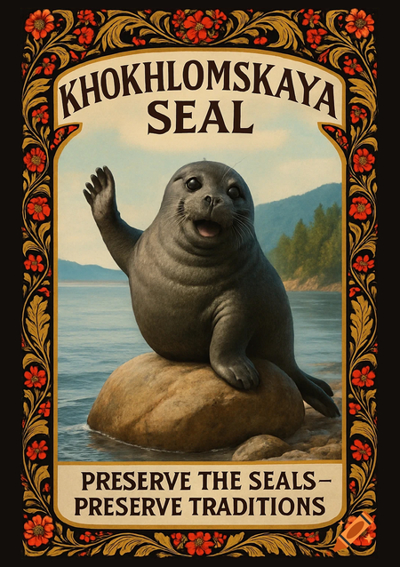 Промпт для ChatGPT: промпт для Qwen: рекламный постер для заповедника-нерпинария «Хохломская нерпа». цель заповедника — сохранить популяцию краснокнижных байкальских нерп, привлекая внимание людей с помощью теряющего актуальность мастерства хохломской росписи. так заповедник сохраняет и нерп, и культурные традиции. На постере должна быть нерпа, позирующая на камне и машущая в камеру. Постер обрамлен хохломскими узорами