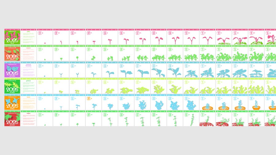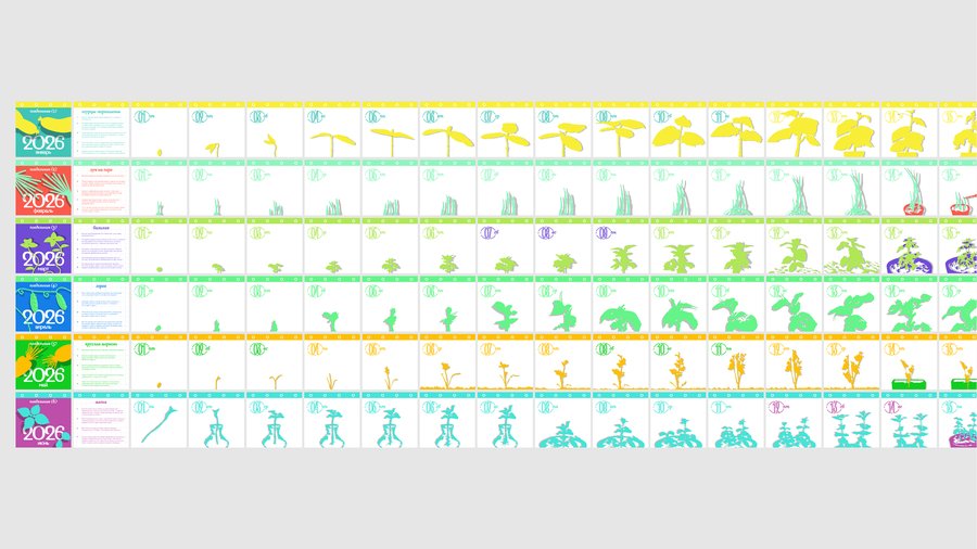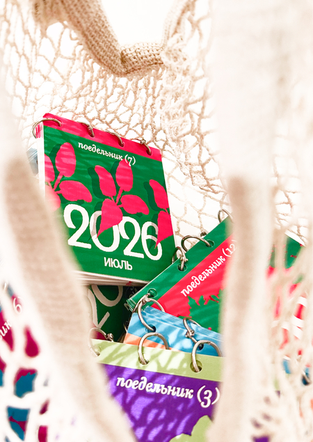 Календарь состоит из 12 календариков, каждый из которых посвящен своему продукту и показывает его полный процесс роста. Эти календари можно использовать и как обычный календарь и просто переворачивать странички, либо использовать в качестве «дневника», в котором ты отмечаешь прогресс, свои эмоции от выращивания своего урожая, все что угодно — ведь главное, чтобы весь процесс был наполнен весельем!