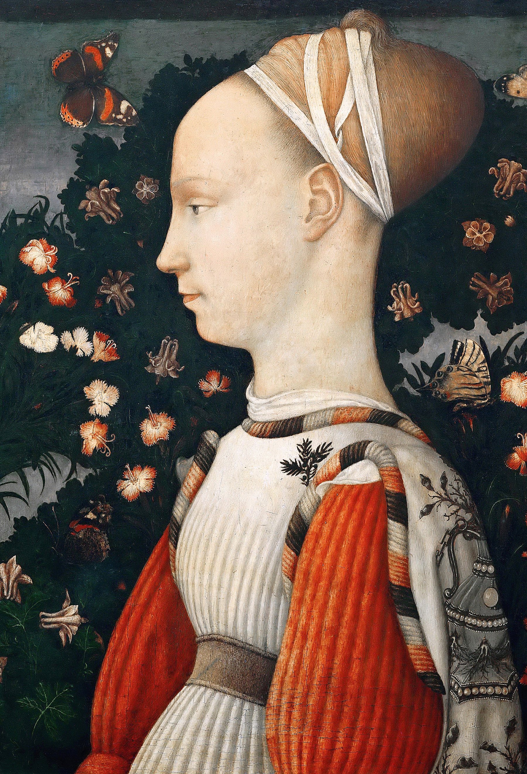 Существует предположение, что портрет был создан посмертно: Джиневра д’Эсте вышла замуж за кондотьера Сиджизмондо Малатесту, приходившегося ей одновременно дядей и двоюродным братом, и умерла при загадочных обстоятельствах. Историки выдвигают разные версии её гибели — от отравления из-за бесплодия или измены до убийства, связанного с желанием мужа жениться на более политически выгодной кандидатуре. Интересно, что бабочка, изображённая над головой принцессы, в таком случае может символизировать раннюю смерть и воскресение. В настоящее время работа находится в Лувре в Париже.