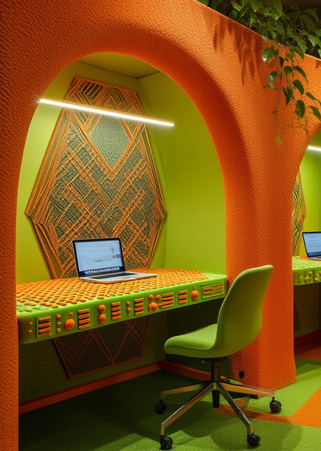 Генеративная модель: REVE Промт: Современное коворкинг-пространство в яркой оранжево-зелёной цветовой гамме. Три отдельные рабочие зоны с арочными входами, в каждой из которых установлено зелёное эргономичное кресло и ноутбук на текстурированном столе с игривыми геометрическими фигурами. Стены и арки обиты оранжевым фактурным материалом, а сверху свисают зелёные растения. Яркое освещение, креативный футуристический дизайн, уютная и одновременно энергичная атмосфера, высокая детализация, реалистичные фотографии интерьера.